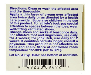Indication: An all-natural Chinese medicine based herbal cream for the treatment of tinea pedis (athlete's foot), tinea cruris (jock itch), and tinea corporis (ringworm). For effective relief of itchy, scaly skin between toes. Clears up athlete's foot infection and with daily use helps prevent reinfection.