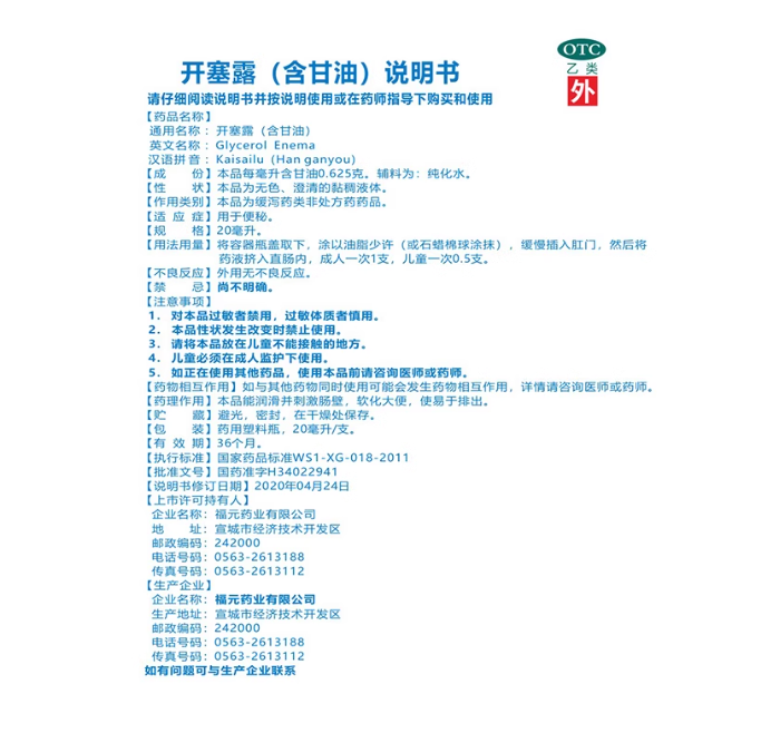 Fu Yuan Yao Ye Kai Sai Lu 福元药业开塞露 20 Piece