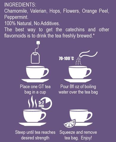 Chamomile, Valerian, Hops, Flowers, Orange Peel, Peppermint.