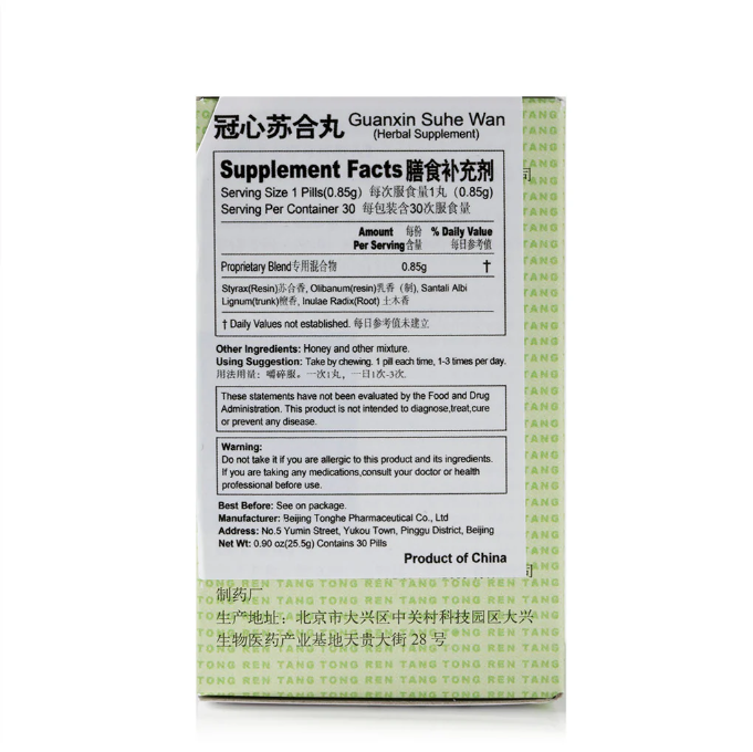 Tong Ren Tang Guan Xin Su He Wan 北京同仁堂冠心苏合丸 30balls