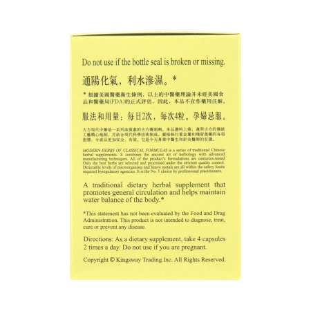 A traditional herbal supplement that promotes general circulation and helps maintain the water balance of the body. Indications: Accumulation of cold water in the Lower Jiao, possibly with external Wind-Cold with Difficult urination, fever, irritability, strong thirst with vomiting after drinking, and headache.