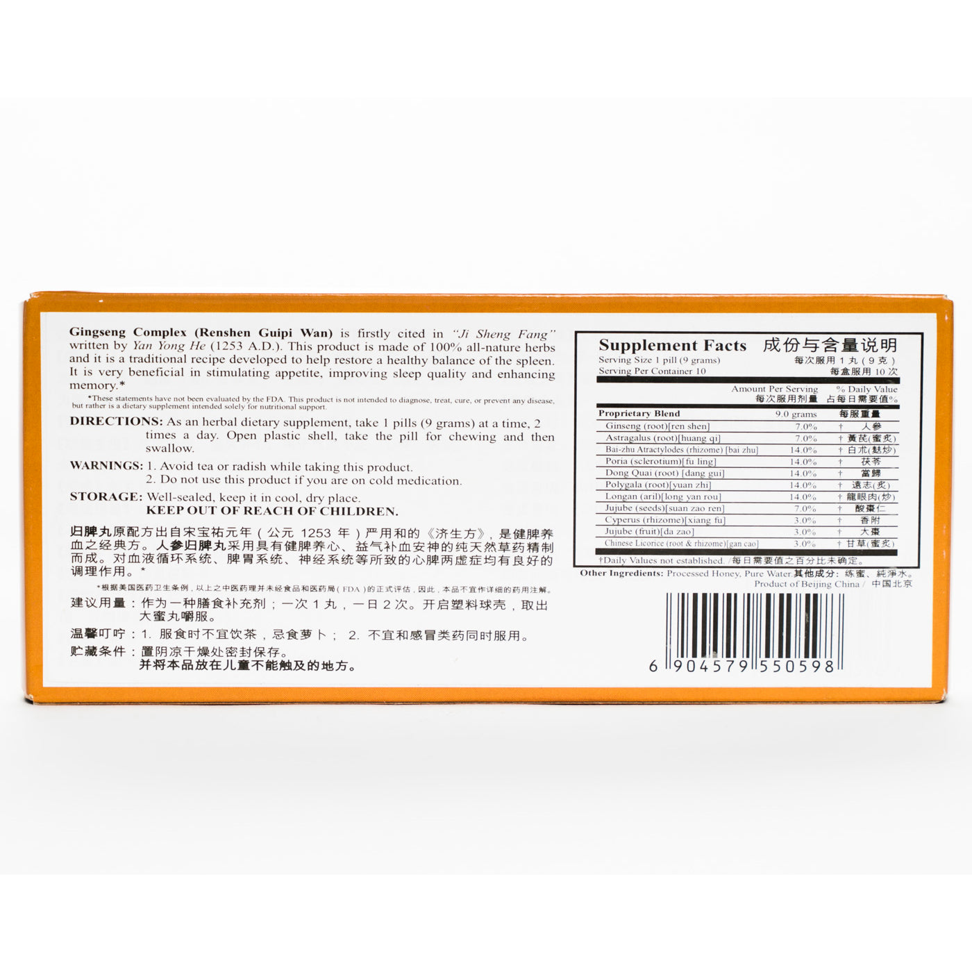 Ren Shen Gui Pi Wan (Ginseng Complex) is firstly cited in "Ji Sheng Fang" written by Yan Yong He (1253 A.D.). This product is made of 100% natural herbs and it is a traditional recipe developed to help restore a healthy balance of the spleen. It is very beneficial in stimulating appetite, improving sleep quality and enhancing memory.