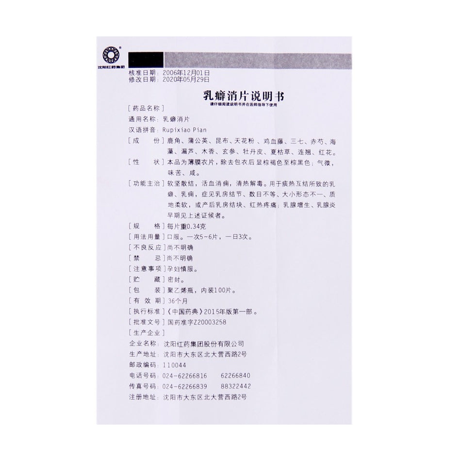 Ru Pi Xiao Pian 乳癖消片(Bo Mo Yi Pian) 100Pills