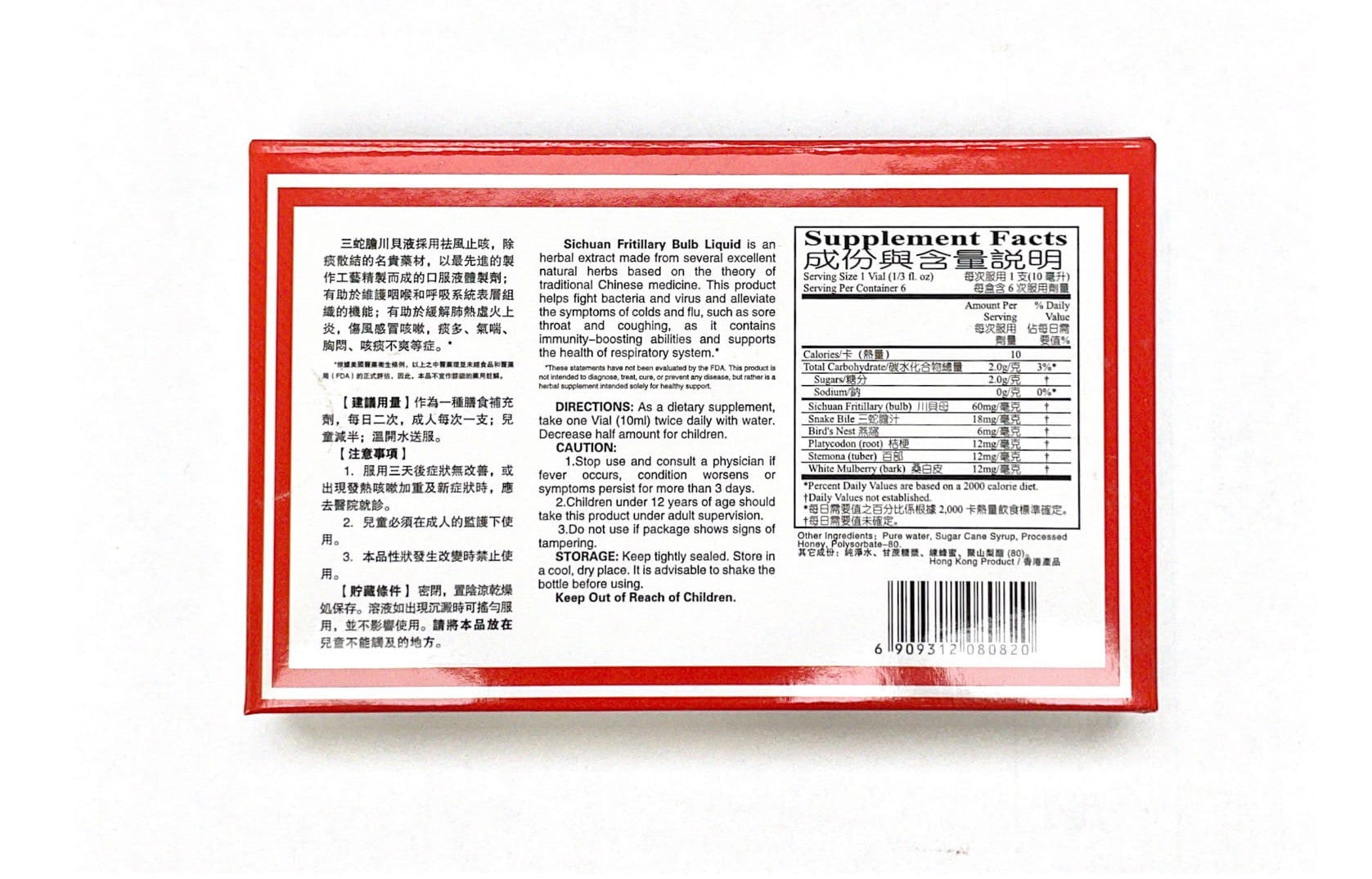 San She Dan Chuan Bei Ye( Cold &Sore Throat) 三蛇胆川贝液 10mlx6Vial
