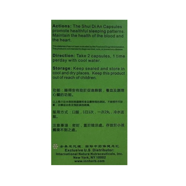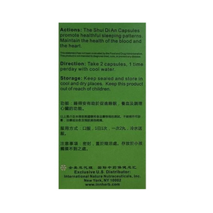 The Shui Di An Capsules promote healthful sleeping patterns. Maintain the health of the blood and the heart.