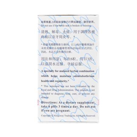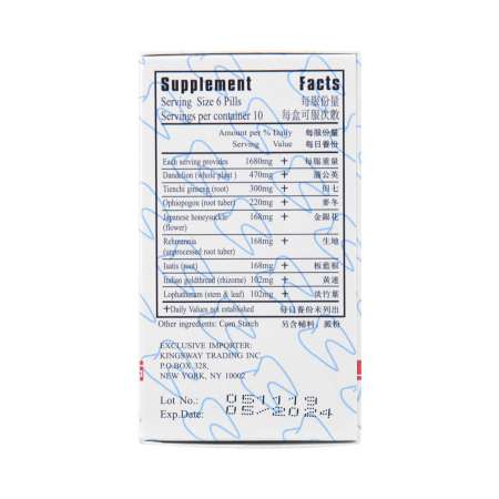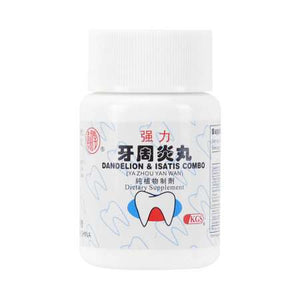 Clearing heat and resolving toxin, reducing inflammation and relieving pain. Used for periodontitis and various tooth pain. Ingredients: Dandelion (whole plant), Tienchi ginseng (root), Ophiopogon (root tuber), Japanese honeysuckle (flower), Rehmannia (unprocessed root tuber), Isatis (root), India goldthread (rhizome), Lophatherum (stem & leaf)