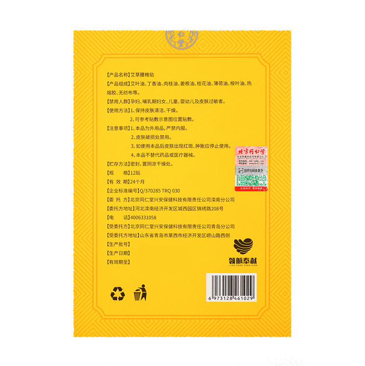 Tong Ren Tang Ai Cao Yao Zhui Tie 北京同仁堂艾草腰椎贴 12patches
