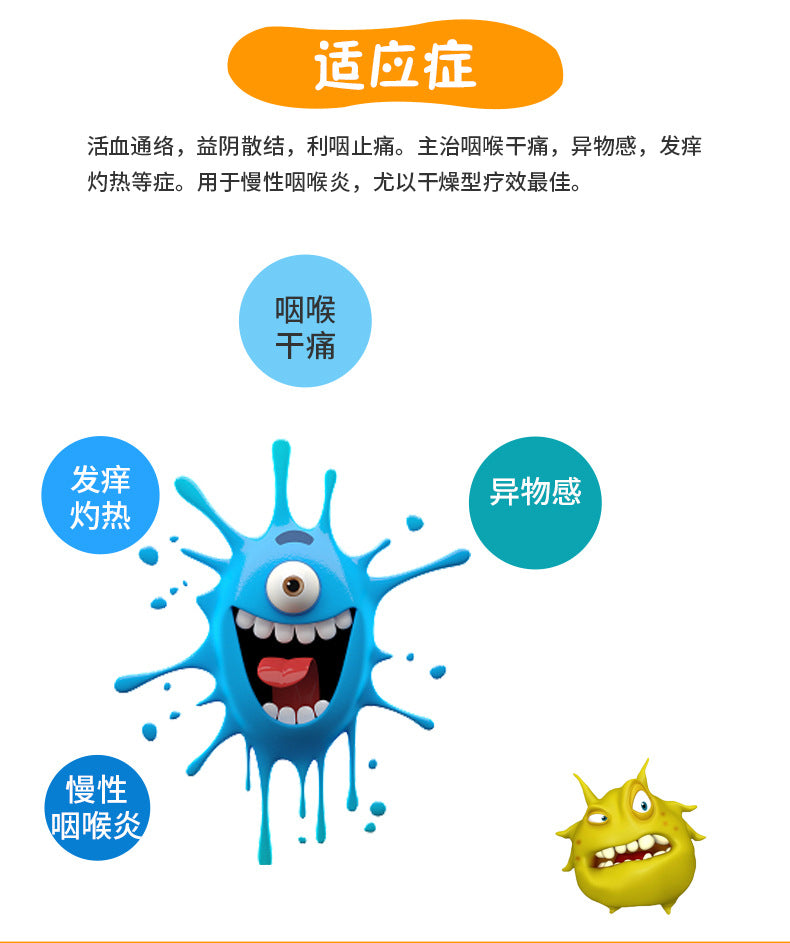 活血通络,益阴散结,利咽止痛。主治咽喉干痛,异物感,发痒灼热,以及慢性咽炎见上述证候者。
