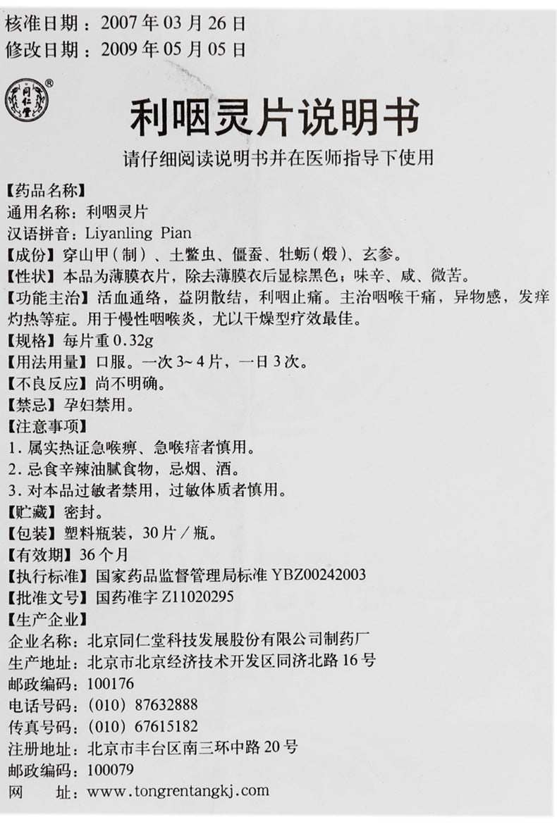 Tong Ren Tang Li Yan Ling Pian 同仁堂利咽灵片