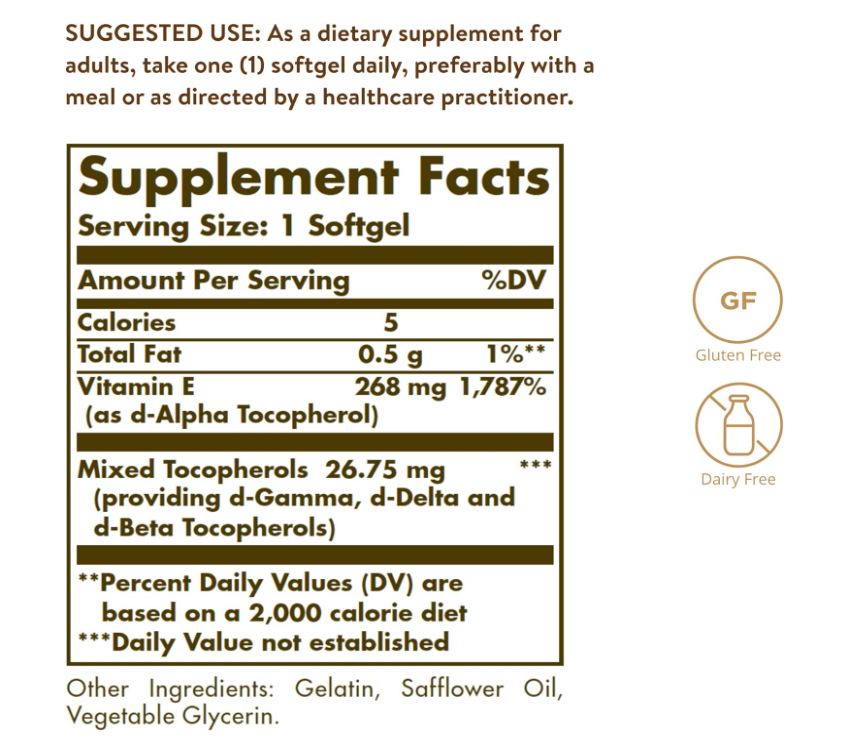 Solgar Vitamin E 268 MG (400 IU) 维他命E 100 Softgels
