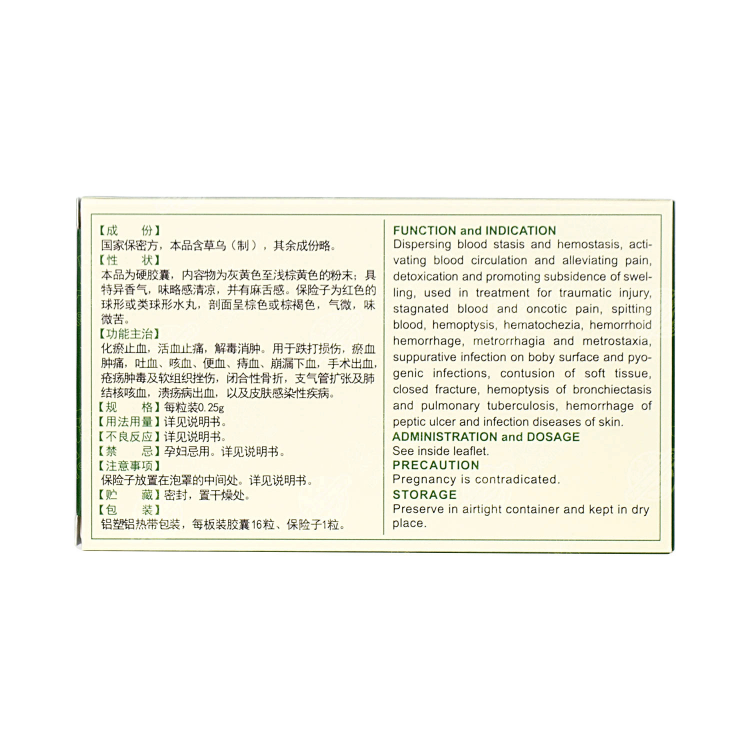 This product is for dispersing blood stasis and hemostasis, acti-vating blood circulation and alleviating pain, detoxification and promoting subsidence of swelling, used in treatment for traumatic injury, stagnated blood and oncotic pain, spitting blood, hemoptysis, hematochezia, hemorrhoid hemorrhage, metrorrhagia and metrostaxia, suppurative infection on body surface and pyogenic inflections, contusion of soft tissue, closed fracture hemoptysis of bronchiectasis and pulmonary tuberculosis, hemorrhage of petic ulcer and infection diseases of skin.