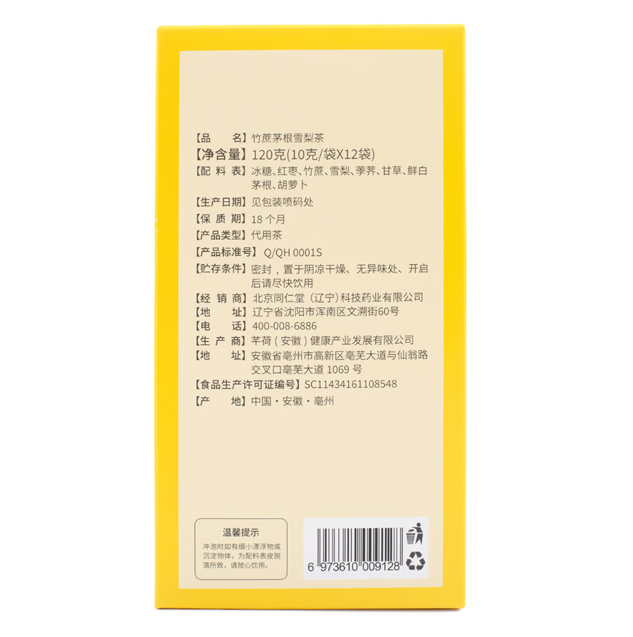 Zhu Zhe Mao Gen Xue Li Cha 同仁堂竹蔗茅根雪梨茶 12bags